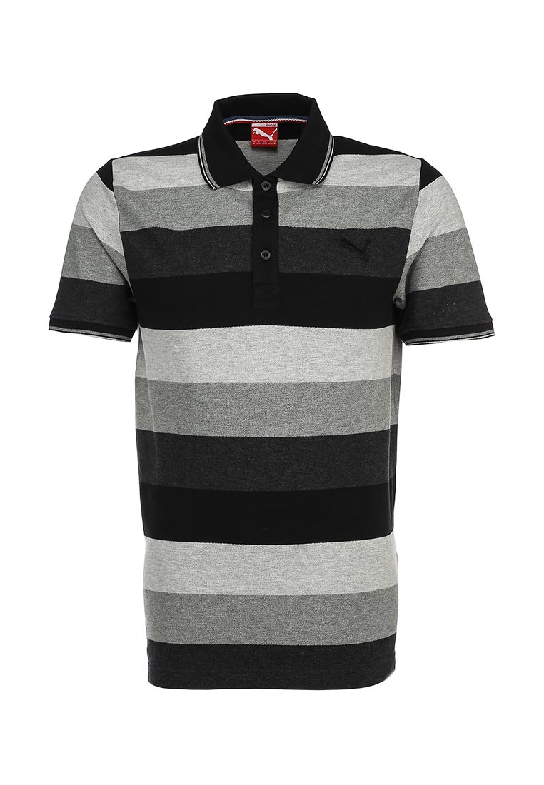 Поло от известной спортивной марки Puma выполнено из натурального хлопка серого цвета. Детали: прямой крой, отложной трикотажный воротник с планкой на пуговицах, короткие рукава с эластичными манжетами, небольшие разрезы по бокам, слегка удлиненная спинка, логотип на груди, контрастные полосы.