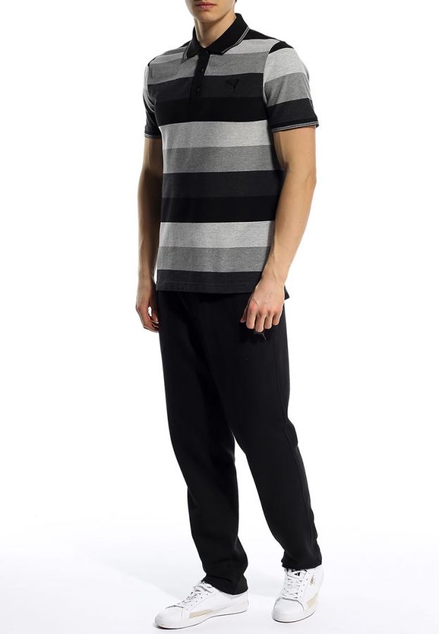 Поло от известной спортивной марки Puma выполнено из натурального хлопка серого цвета. Детали: прямой крой, отложной трикотажный воротник с планкой на пуговицах, короткие рукава с эластичными манжетами, небольшие разрезы по бокам, слегка удлиненная спинка, логотип на груди, контрастные полосы.