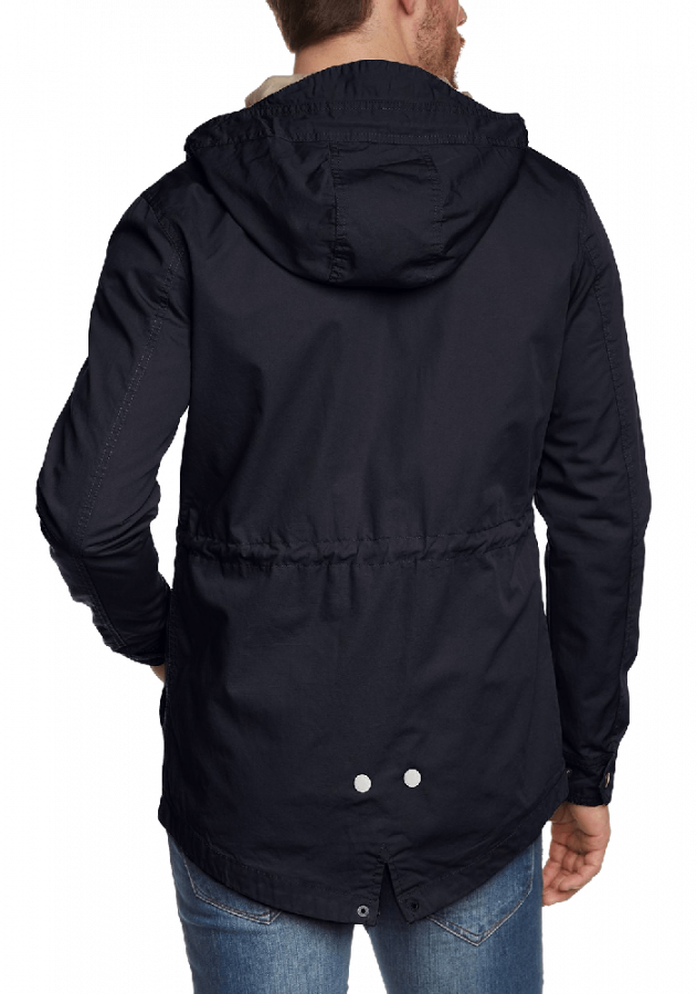 Парка выполнена из прочного непромокаемого текстиля черного цвета и утеплена синтепоном. Модель прямого кроя с кулисками на талии и по низу. Детали: регулируемый по ширине капюшон с флисовой подкладкой оторочен искусственным мехом, воротник с трикотажной подкладкой, застежка на молнию и клапан на пуговицах, один внутренний и шесть наружных карманов, внутренние эластичные манжеты, разрез на спинке сзади.